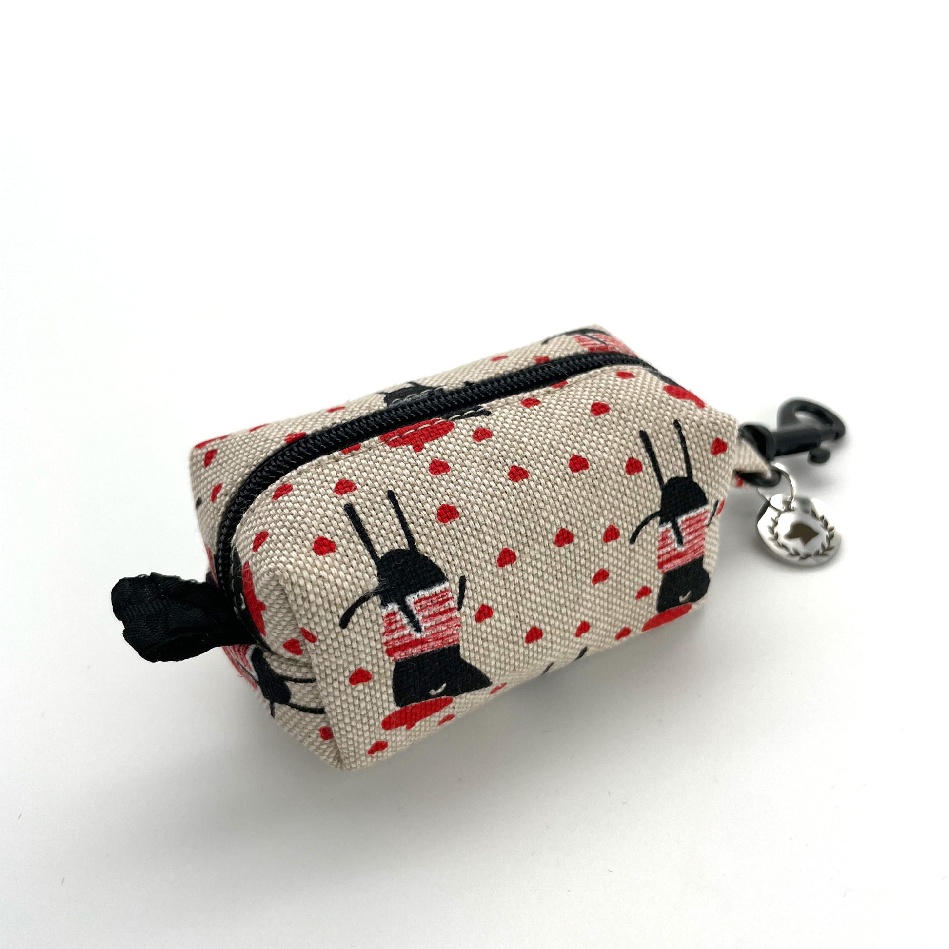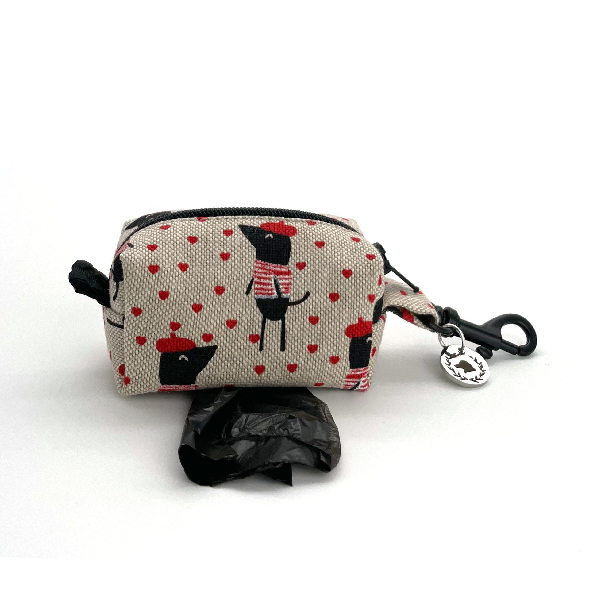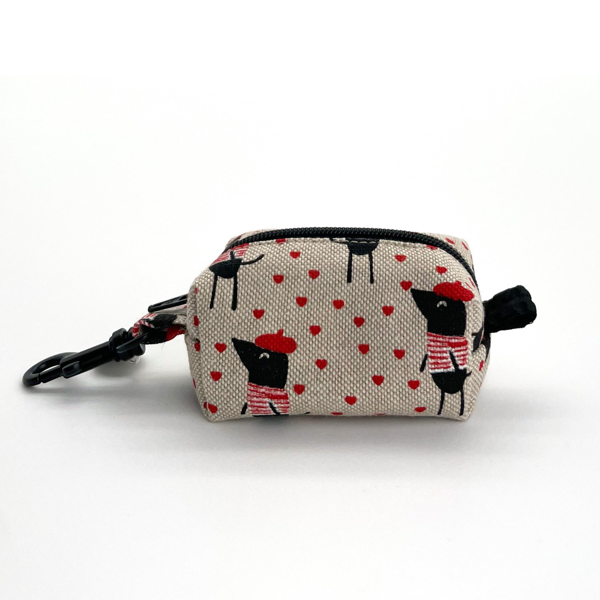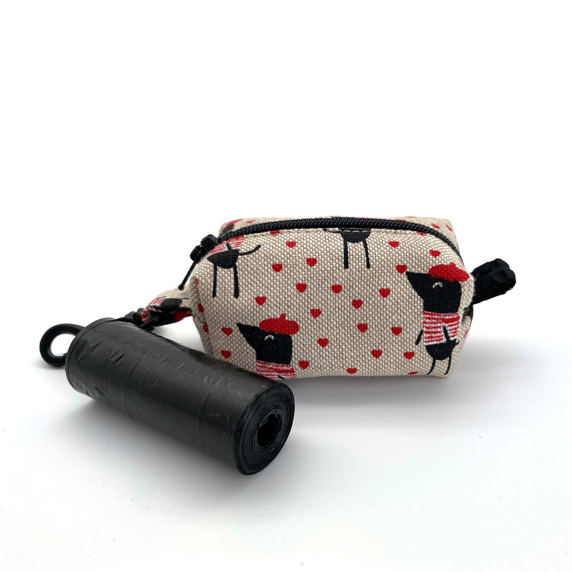 Die Kotbeutelrolle wird einfach über die Reißverschlussöffnung eingelegt, das erste Beutelchen der Rolle ein Stück durch die Öffnung des Kotbeutelspenders gezogen – und schon kann’s losgehen. Dank des stabilen Messingkarabiners lässt sich das kleine Täschchen mühelos an Hundeleine, Tasche oder sogar an der Gürtelschlaufe befestigen.
