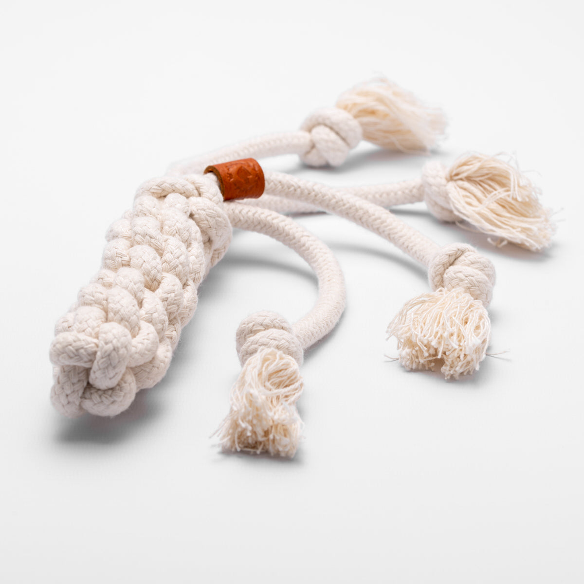 ROCKET aus ungebleichter Baumwolle lässt die Herzen aller Zerr-Liebhaber höher schlagen. Seine langen, geknoteten Enden laden zum Anheizen und Reinbeißen ein, zum Zerren eignet sich hingegen wunderbar ROCKETs fest geknüpfter Teil.